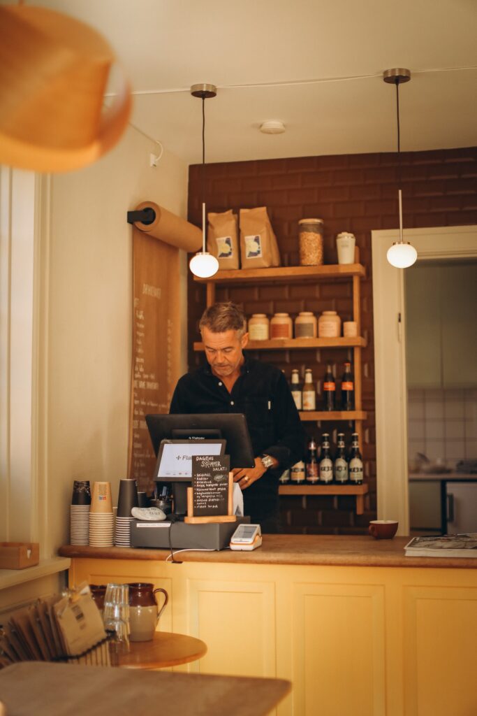 Vi sidder i sofaen på Albis en formiddag, hvor solen rammer ruderne og espressomaskinen kører derudaf. Troels rejser sig et par gange for at svare på spørgsmål eller hjælpe med en drilsk maskine, men ellers glider alt. Den unge medarbejder bag disken betjener kunderne med ro og overskud. Der er ingen ventetid, der er plads til snak, og stemningen er afslappet og venlig.